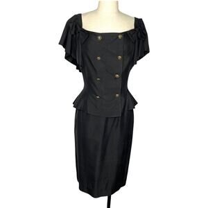 Vintage 1980s 2 piece raw silk set with ruffle sleeve, bow detail on shoulder, peplum hem blouse with gold lattice buttons and wiggle pencil skirt . Marked size 4, as vintage tends to run small, please use measurements as a guide