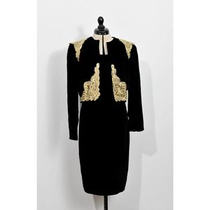 This is the very best version of a little black dress that I can imagine! The dress itself is a sheath made of buttery rayon/silk velvet, with a high neck in the front but a low back. Classic and gorgeous! Then add in the matching jacket with gold detailing and you're ready to rock a New Year's party! Amazing!