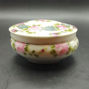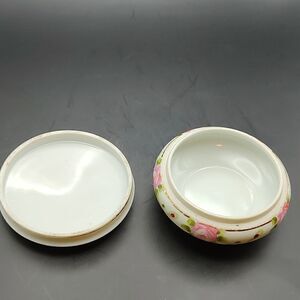 Vintage Nippon Hand Painted floral lidded powder jar in pink, white and green with gold trim accents. Great storage for all your small things like desk items, make up, jewelry and bathroom items. This lidded powder jar is a lovely gift by itself or can be a lovely container for a small gift.