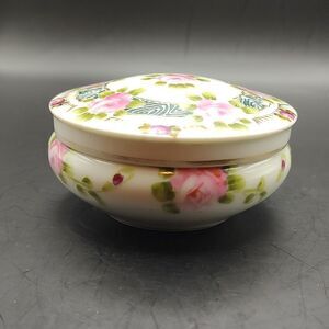 Nippon Hand Painted Floral Lidded Powder Jar Gold Trim Accents Vintage Stamped