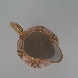 This delicate antique cream pitcher showcases intricate hand-painted floral designs with elegant gold trim. Its footed base adds a touch of sophistication.