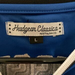 Vibrant royal blue jersey with white trim. Features bold script and number. Perfect for active wear.
