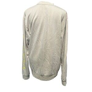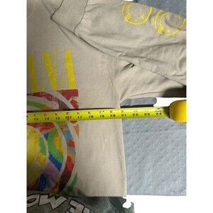This Nirvana Happy Face Logo Cotton Blend Crew Sweatshirt in size Medium is a nostalgic piece featuring a graphic print of the iconic band's logo. Made from a comfortable cotton blend material, this pullover sweatshirt with long sleeves and a crew neck is machine washable and perfect for all seasons. The beige color adds a vintage touch to the 90s rock and music theme, making it a must-have for any fan of Nirvana or grunge music.