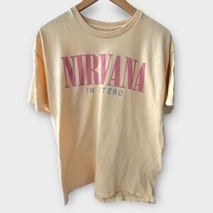 A classic Nirvana tee with a soft, vintage-inspired feel and that perfectly oversized, grunge aesthetic. Features front “NIRVANA In Utero” lettering in pink and blue, and the iconic angel graphic on the back.