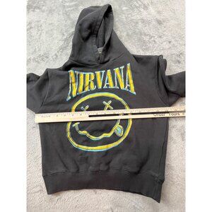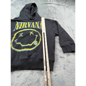 This black Nirvana Sweatshirt for kids, sized 7, features the iconic smiley face graphic. Made from a cotton-polyester blend, it's comfortable and stylish.