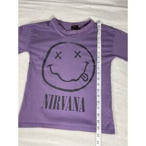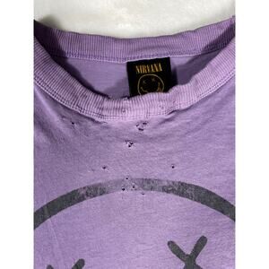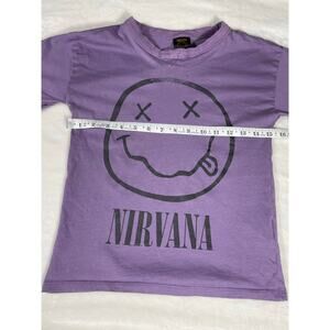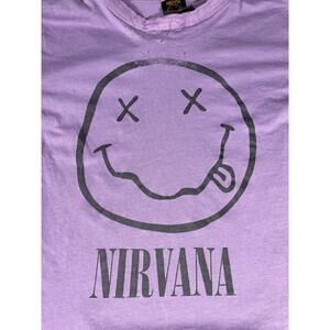 Licensed Nirvana Kids Collab tee featuring the classic smiley face logo. Purple cotton shirt with a lived-in feel and minor distressing near the collar (see photos). Soft and lightweight.