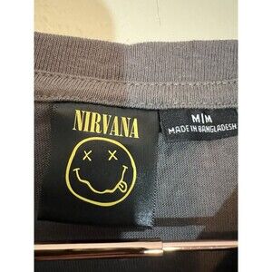The Nirvana Nevermind Band Tee in unisex size M features a graphic print of the iconic band's logo in gray and black colors. This short sleeve t-shirt is machine washable and perfect for fans of Nirvana looking to show off their band pride. Made for men, this regular fit shirt is a stylish addition to any music lover's wardrobe. Some deodorant on bottom of shirt from try on but otherwise new with out tags