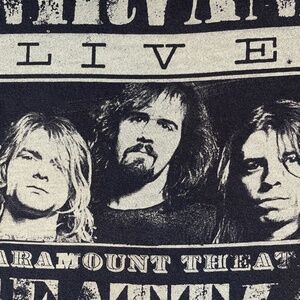 Celebrate an iconic moment in grunge history with this Nirvana “Live at Paramount Theatre” Halloween ’91 tee. Features a bold black-and-white graphic of the band and vintage-style weathered text. While the shirt references the legendary Seattle show, it appears to be a 2000s-era reprint (not vintage) and contains an incorrect venue address — a quirky misprint that makes it a fun collector’s piece.