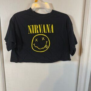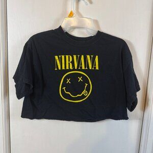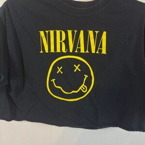Channel your inner rock rebel with this classic Nirvana cropped band tee. Featuring the iconic yellow smiley face logo and bold NIRVANA text on soft black cotton, this cut-off T-shirt brings vintage grunge vibes to any outfit. The raw hem gives it an edgy, lived-in look—perfect for pairing with high-waisted jeans, denim shorts, or layered under a flannel.
