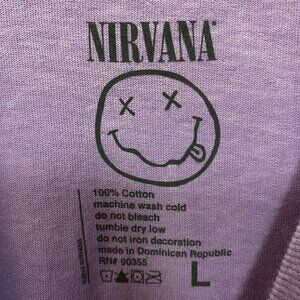 Nirvana Smiley Face Grunge Rock tshirt size Large. Generally measures 21 inches pit to pit and 28 inches Long. Amazing graphic design shirt, perfect for Nirvana fans. New never worn overstock in great condition.