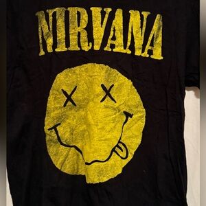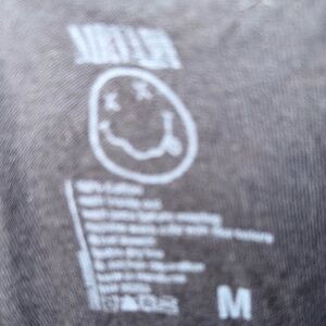 This is a vintage Nirvana T-shirt for men in size large. It features a crew neck, short sleeves, and a black color with a gold graphic design. Made of cotton in the 2000s, this grunge-themed shirt is machine washable and has a regular fit. The brand is Nirvana, and it is a punk-style T-shirt with no personalization.