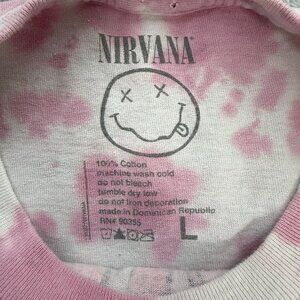 Nirvana T-Shirt Womens Large Smiley Yelllow Graphic Pink Tie Dye Retro Grunge Band Music Festival