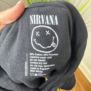 Nirvana Unisex Pullover Hoodie Sweatshirt Yellow Smiley Black Acid Wash SZ Small