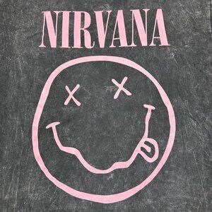 Nirvana Women Size L Black Wash Pink Happy Face Graphic Print Tee T-Shirt NWT