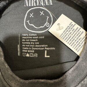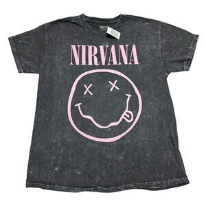 Nirvana Adult Size L Black Wash Pink Happy Face Graphic Print Tee T-shirt NEW