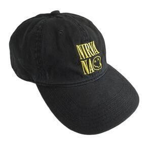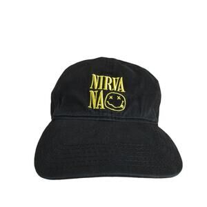 This ball cap features "Nirvana" embroidered in yellow with the drunk smiley face icon. It has a padded headband, slightly curved visor, 6-panels and adjustable back strap. Dates from 2018.