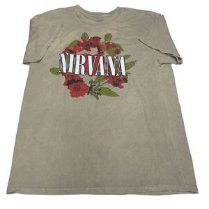 Features and details: acid washed mushroom tan or gray color tee, Nirvana Heart Shaped Box artwork on front, short sleeves, crew neckline, medium weight, unisex fit