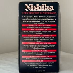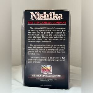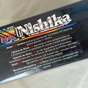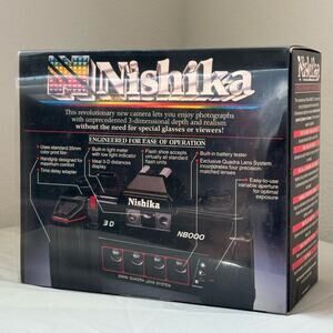 Nishika N8000 35mm 3D camera— new in box. This amazing film camera shoots 4 1/2 frame photos at once at slightly different angles. The result is a four frame series that can be edited into GIF form. If you’ve ever seen those vintage film looking GIFs, this is how they made them. This camera has never been used and is untested but presumably working. It’s in perfect factory shape including the original plastic wrap. It comes with a strap and two very old unused AA batteries.