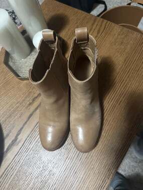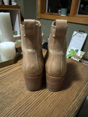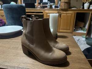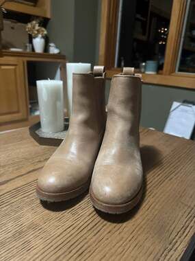 Nisolo Chelsea Booties in an almond/tan leather, Women's Size 7.5. These classic heeled ankle boots feature elastic side goring and a pull tab for easy wear. Designed with a durable lug sole for added traction and style. Pre-owned condition with some light surface scuffing and natural creasing from gentle wear. Perfect for everyday fall and winter outfits. High-quality sustainable leather construction.