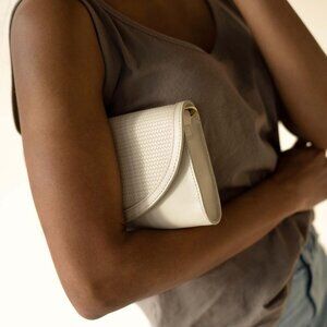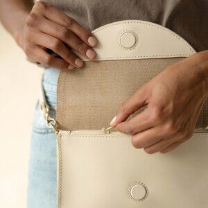 Elegant off-white crossbody bag by Nisolo. A clutch, a belt bag, a crossbody, a half-cross, an over the shoulder bag, and an interior wallet to keep you effortlessly organized— you name it, it was designed to do it.