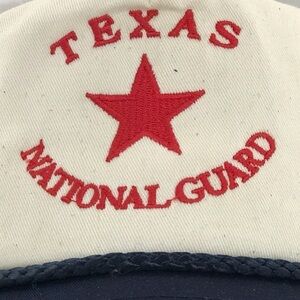 M9 Hat/Cap Nissun Cap Philippines Adult Adjustable SnapBack or Snap Back Strap TEXAS NATIONAL GUARD type & star on dome face in red / Offwhite dome with blue accents, blue rope along seam of dome and blue brim Offwhite & Blue Cap Pre-worn Vintage