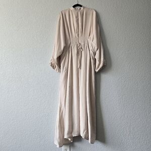 This elegant dress features a cinched and pleated waistline that creates a flattering silhouette. The bodice gracefully gathers into the waist, enhancing the overall fit and adding a touch of sophistication. The flowy sleeves cascade gently from the shoulders, offering a dreamy and ethereal look that complements the structured waist. Made from lightweight, airy fabric, this dress combines timeless elegance with modern charm, perfect for any special occasion.