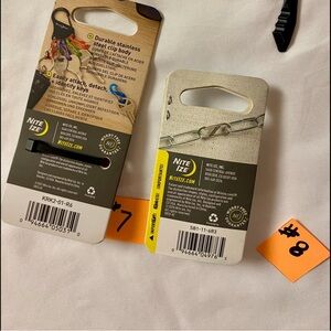 # 4 - doohickey side clip multi tool key & 6 plastic S biners multi tool has a serrated edge, a bottle opener, a scoring point, & a screwdriver.
