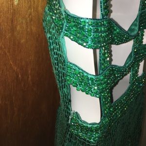 This dress is simply one of a kind! Absolute showstopper. Perfect cocktail dress for any event: Holiday party, NYE, Prom, Wedding. Brand: Niteline Della Roufogali, Designer: Della Roufogali. Body is embedded with sequins and shoulder straps & back covered with gorgeous emerald green/iridescent beads. Super clean. A couple sequins missing (pointed out in photos-easy fix). All beads & hooks/clasps are intact. Retails $950. Use offer button if interested!