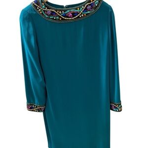 Niteline Della Roufogali Petite Size 10 Emerald Green Cocktail Evening Dress. This dress is in excellent condition with no flaws. It has colorful rhinestones around the neck and sleeves. Very nice dress for different ocassions.