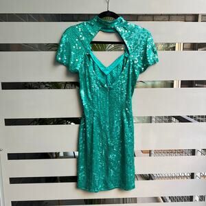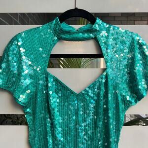 Niteline vintage turquoise sequin party cocktail dress. Perfect for Vegas or New Years! Front sweetheart neckline cutout & back cut out. Short sleeves and a high neck. Back neck closure & back zipper closure on body. Fit & flare body silhouette. Size 6 - fits true to size, model is a true size US 6.
