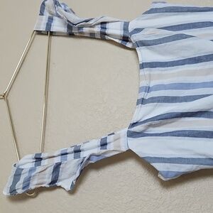 Bring on the stripes. The Nivani Linen Jumpsuit is the perfect addition to your summer wardrobe. Made of a lightweight, breathable linen blend this jumpsuit features ruffled crisscrossed straps, side pockets, and invisible zipper closure along the back.