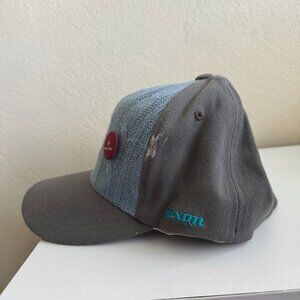 Unique and stylish Nixon flexfit hat featuring a gray bill and sides with a cozy blue cable knit front panel. Burgundy “We Are Nixon” button detail on front. Embroidered logo on back. Size S/M.