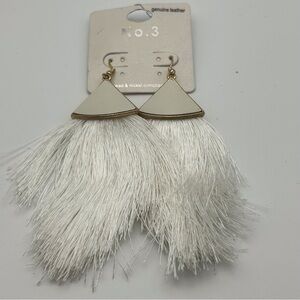 No. 3 White Genuine Leather Dangle Large Tassel Earrings Gold Tone Hook