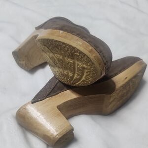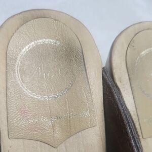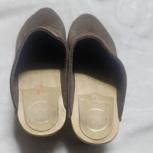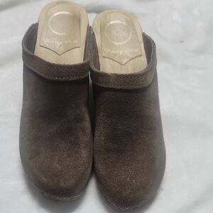 Stylish brown suede mules by No. 6. Comfortable wooden heel. Perfect for casual wear.