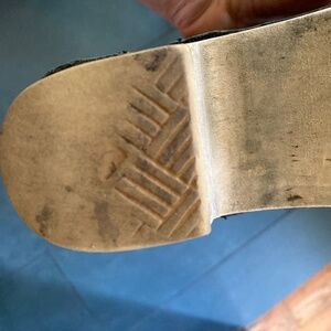 This No. 6 leather clog buckle boot features a midheel and comes in a sleek black color. Designed for women, this bootie has a buckle closure and is made of high-quality leather. It has a US shoe size of 8.5 and an EU shoe size of 39. There is some mild scuffing at the toe but the leather is otherwise in excellent shape, and the scuffing not visible when polished. Weatherized leather. The heel has some wear and tear, but could be replaced. Includes the shearling insert.