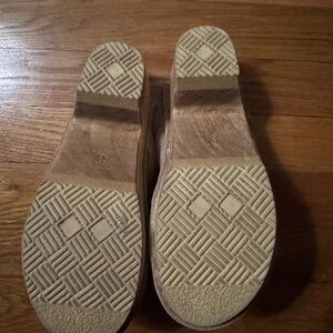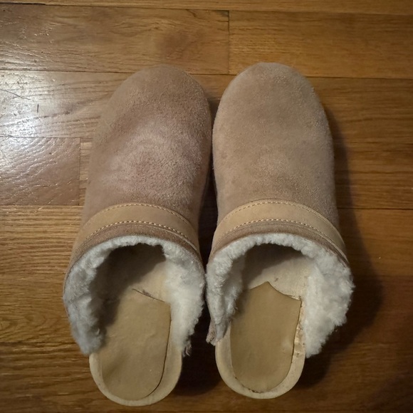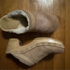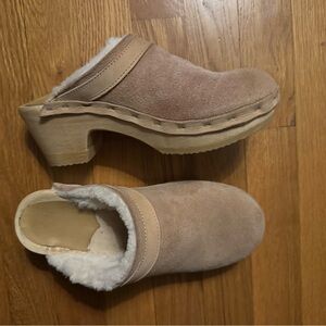 Gently worn No. 6 shearling clogs, only worn indoors. Shearling lining is clean and in great condition. Small cosmetic discoloration on left clog suede exterior from prior cleaning which does not affect wear or functionality and is reflected in price. See photos for close ups. Ships with original box.