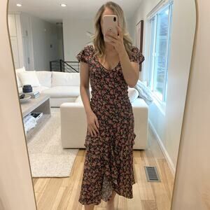 Number 6 Store NY 100% Silk Floral V-Neck Midi Dress in Espresso London Floral. Short sleeve midi dress with ruffle detailing on bottom and a v-neck plunge front. Great used condition.