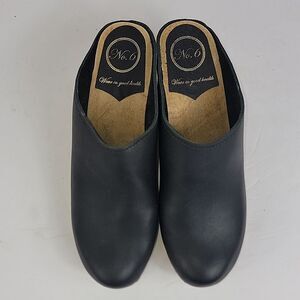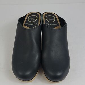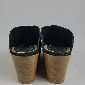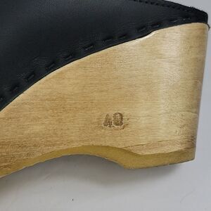 Rising slightly higher to the ankle and hugging to the sides of the bottom heel in a black unlined leather with a simple stitch detail at the edge. Natural wood wedge rises from .5" to 3" at the heel. Water repellent leather and lacquered wooden base. Made in the USA.