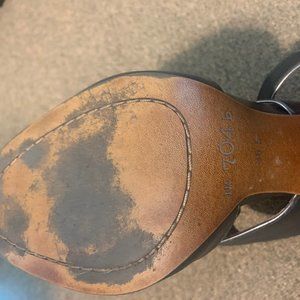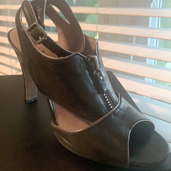 Versatile dark grey leather (almost black) pumps with silver trim and nice lighter gray detail on heel. Sipper does zip. 4 inch heel. Moderately worn and in great condition. Very comfortable.