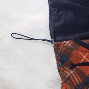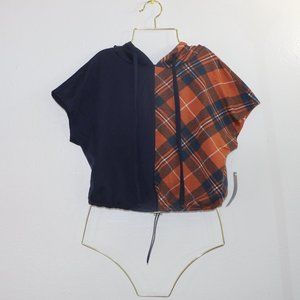 Half navy blue and half plaid (brown, navy, and white)