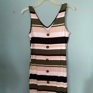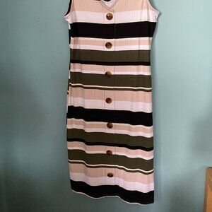 This No boundaries V-Neck summer dress is made up of 92% Polyester and 8% Spandex. It is a fitted dress but very comfortable when worn.