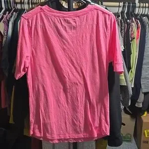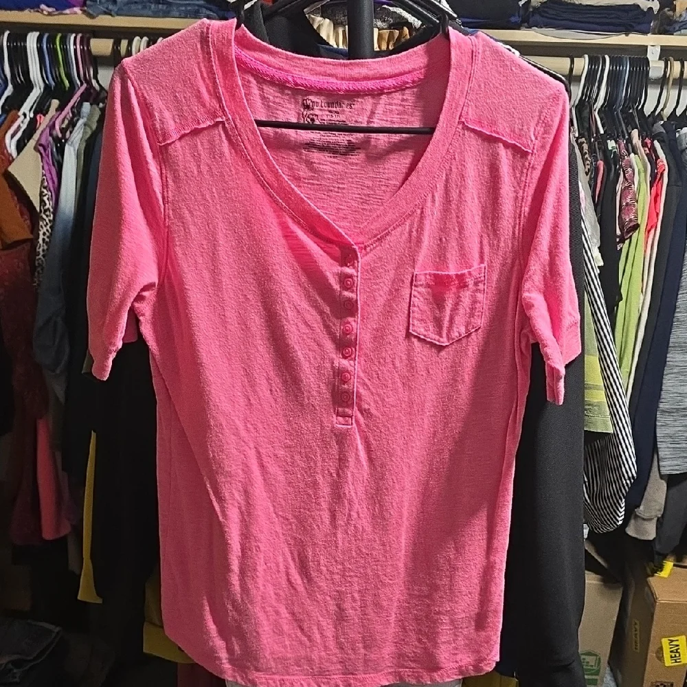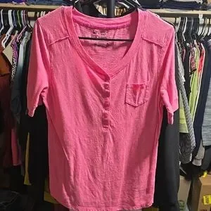 Bright pink tee with button details. Features a chest pocket. Perfect for everyday style.