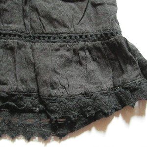 No Boundaries black ruffle mini skirt with lace trim. Elastic waistband. Pair it with leggings and your favorite top for a playful summer look.