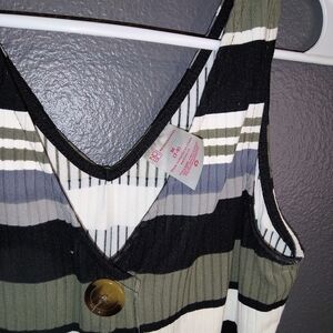 Stylish striped dress with button details. Sleeveless design. Perfect for casual outings.