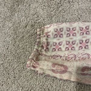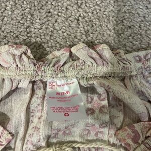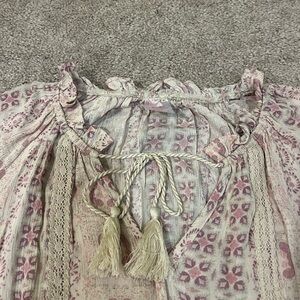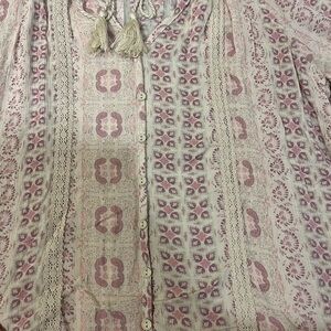 In good shape! Lightweight material! Cute tie neckline with tassels! Cream and pink pattern! Perfect for work or a night out! Offers always welcome!