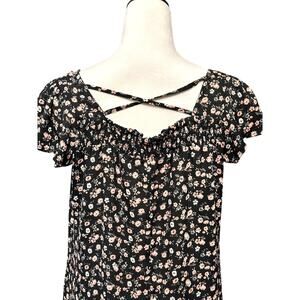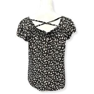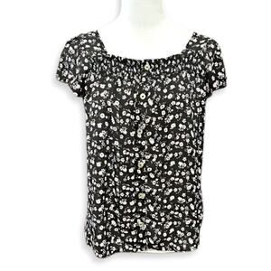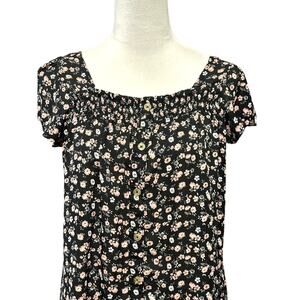 No Boundaries Blouse Floral Button Down Short Sleeve Black White Juniors L 11/13