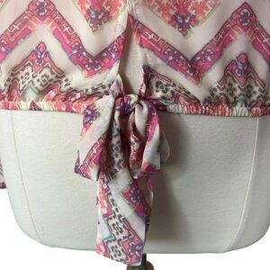 This lightweight blouse features a chevron pattern with a flattering tie hem and crochet accents. It's versatile for both casual and semi-formal outfits.