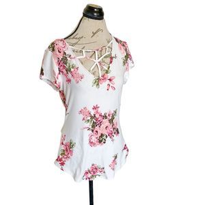 No Boundaries Blouse Size Large Size 11-13 Floral Short Sleeve Crochet Cut Out