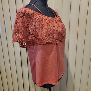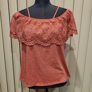 Pink off-the-shoulder spaghetti strap top with crotchet cover by No Boundaries. Size 3X (21)