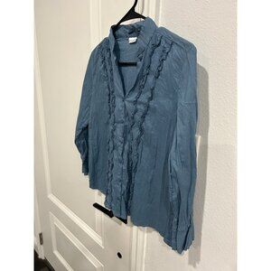 No Boundaries Button Front Ruffle Chambray Shirt Blue Embellished Career OffIce